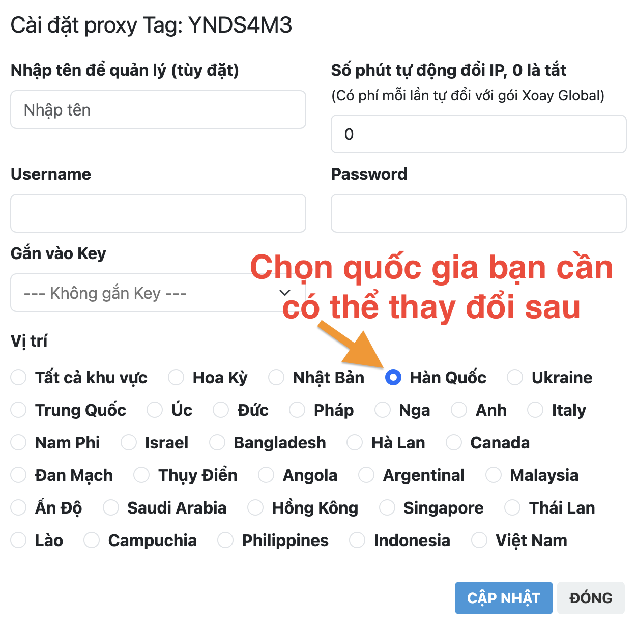 Sau khi Thanh toán thành công truy cập Proxy đã mua -> Cài đặt -> Cập nhật để chọn quốc gia bạn cần