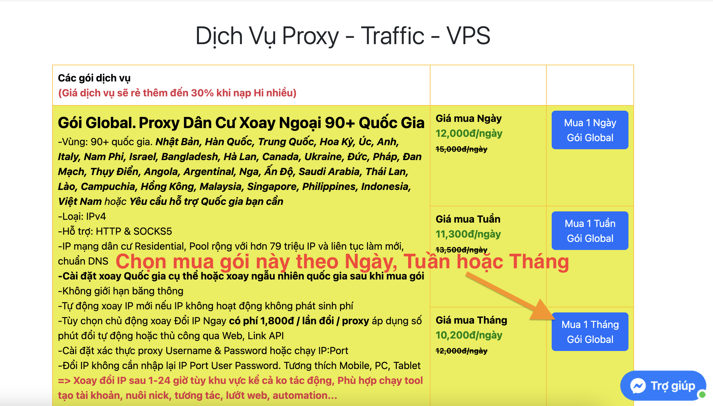 Sau khi tạo tài khoản xong truy cập mục Nâng cấp / Dịch vụ tìm gói Global , lựa chọn tùy chọn mua proxy theo Ngày, Tuần hay Tháng mặc định mua tối thiểu từ 1 Proxy và Thanh toán theo hướng dẫn trên website.